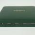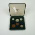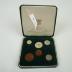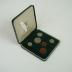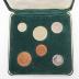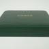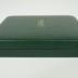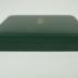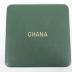 Green leather case for coin set from Ghana. Square case, with capital gold lettering on top "GHANA". Hinged at back. Inside has white lining on top with Royal Mint crest image, accession number sewn into the top. Bottom is lined with fuzzy green material and has indented spots to hold 6 coins of various size. Marks/Labels