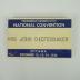 Mrs. John Diefenbaker convention identification badge. White card with blue strips on top and bottom. Capital white and black text. Plastic strip and metal pin clasped onto back. Marks/Labels