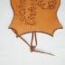 Vinyl badge. Curved shield shape with 4 point along the top, and pointed bottom. Line creating a bordered edge. On one side is "1974 Prince Albert Saskatchewan" in capital block lettering. Middle vinyl has circular textured background. Text and images part of vinyl. Image of an archer wearing a hat, feet apart, preparing to shot an arrow. Other side is smooth with "John G. Diefenbaker" engraved vertically and an image of a lion standing on back legs with pointed fur edges. Marks/Labels