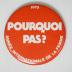 Round French Internatioal Women's Year badge (pin/button) with red background and capital white text. "POURQUOI PAS" large text in the center. Women's gender symbol as the point of the "Q". Other text smaller and curved along bottom rim. Pin attached to metal back and clasped into side bar.Marks/Labels