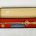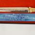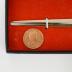 Red rectangular inner lining of a black paper box. Holds a blue-silver plaque, coin, and letter opener. Plaque reads, "Presented to The Right Honourable John G. Diefenbaker on the occasion of his visit to Br. No. 216 Laval West Sunday 9 Nov. 1975."Marks/Labels
