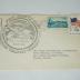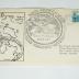 A First Day Cover containing a map of the first submerged Northwest passage stamped in black ink with the USS sea dragon in the middle of the map. A unique circular stamp of the USS sea dragon in the middle. Surrounded by capital block-letter text. Sea dragon is breathing fire with fingers wrapped around a block and broken pieces beneath it. Circular stamp with date in center to its right. Overlaps 4 cent blue Arctic Explorations 1909 stamp featuring white globe, man dogledding, and 571 submarine. 4 cent U.S. Postage July 4, 1960 stamp on top right corner featuring American Flag. 7 squiggly lines overlapping stamps on top right corner. Text on bottom right. Marks/Labels