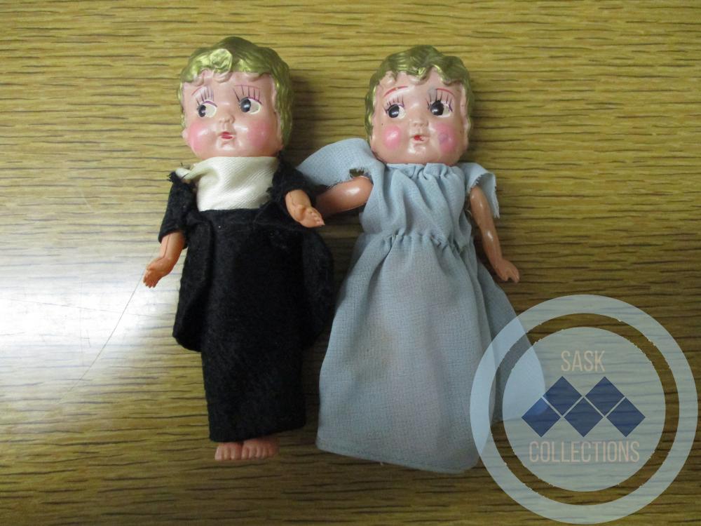 Two small, hollow, plastic dolls. They have light skin, rosy cheeks, red lips, thin eyebrows, dark eyes, and golden, finger-waved hair. One is in a blue dress and the other is in a black and white dress with a black jacket .Materials